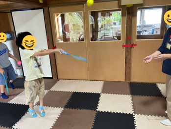 室内チームは職員が投げたボールを打ち返す練習に挑戦。試合ではありませんが、当たるたびに嬉しそうな笑顔を見せてくれました。