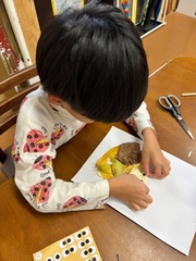 次の日は、拾ってきた落ち葉を使って「みのむし」「ハリネズミ」「フクロウ」の壁面づくりに挑戦!