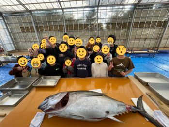 解体前の大きなマグロの前で記念撮影