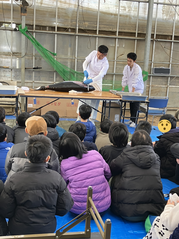 目の前で行われた迫力満点の解体ショーでは、大きなまぐろが職人さんの手によって次々とさばかれていきました。普段なかなか見ることのない光景に、子どもたちは目を輝かせながら真剣な表情で見入っていました。